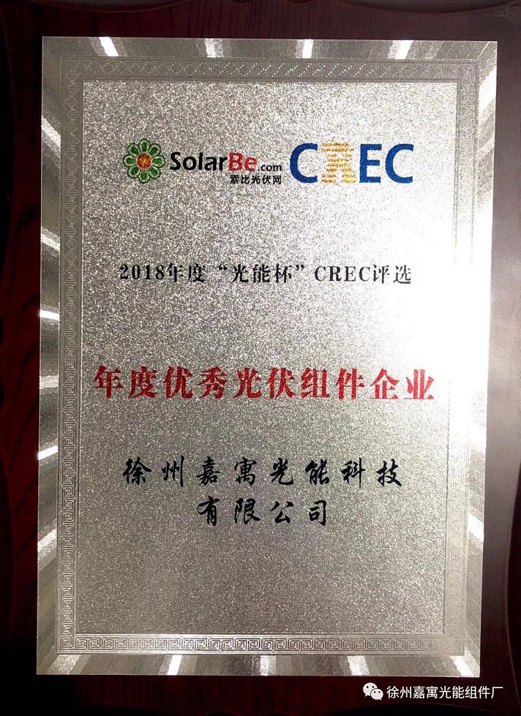 10月31日,由中國(無錫)國際新能源大會暨展覽會CREC、Solarbe索比光伏網、《光能》雜志共同主辦的2018CREC光能杯光伏行業頒獎晚會盛大召開,徐州嘉寓光能榮獲“年度優秀組件企業大獎”。