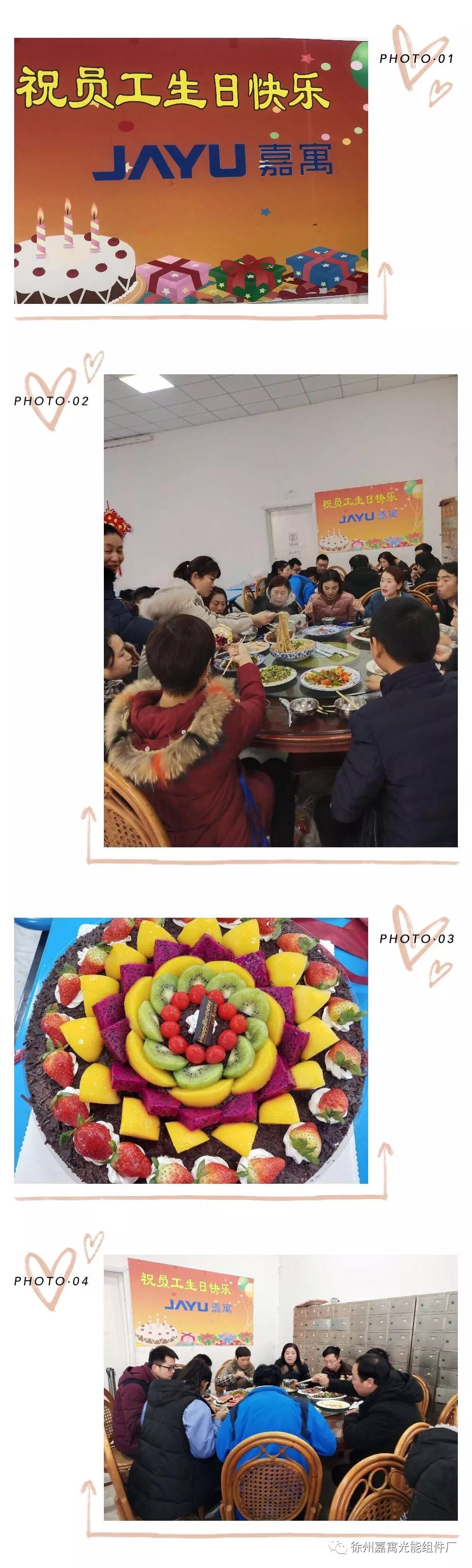嘉寓光能一直致力于打造溫馨和睦、包容奉獻(xiàn)的大家庭,努力營造出輕松和諧的工作氛圍,讓每一位員工切身感受來自大家庭的溫暖。所以,每個月我們都有一個特別的日子,它傾注了公司對員工的親切關(guān)懷和愛。一個大大的生日蛋糕,一碗滿滿的長壽面,一餐豐盛的美食,一張張幸福的笑臉,讓整個生日會都蕩漾在了溫馨幸福的長河里。