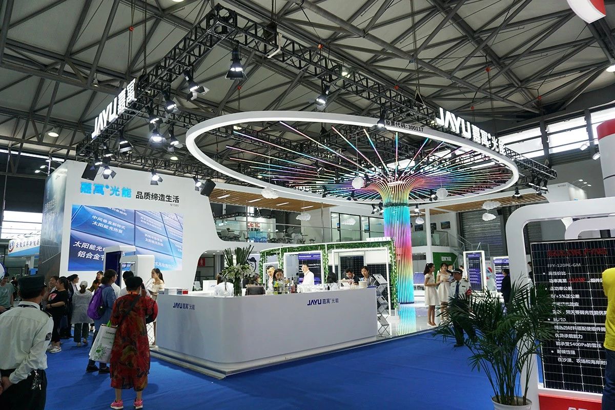 嘉寓光能展位位于N1展館580展臺,主色調以象征著藍天白云的嘉寓藍和白色構成,凸顯了清潔能源的特色。同時展臺中央一棵巨大的七彩能量樹拔地而起,象征陽光能源的彩色光束從地面升空,在頂端向整個展臺四周發散,將希望的陽光,普照天下。